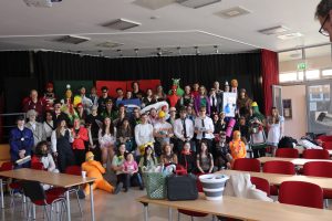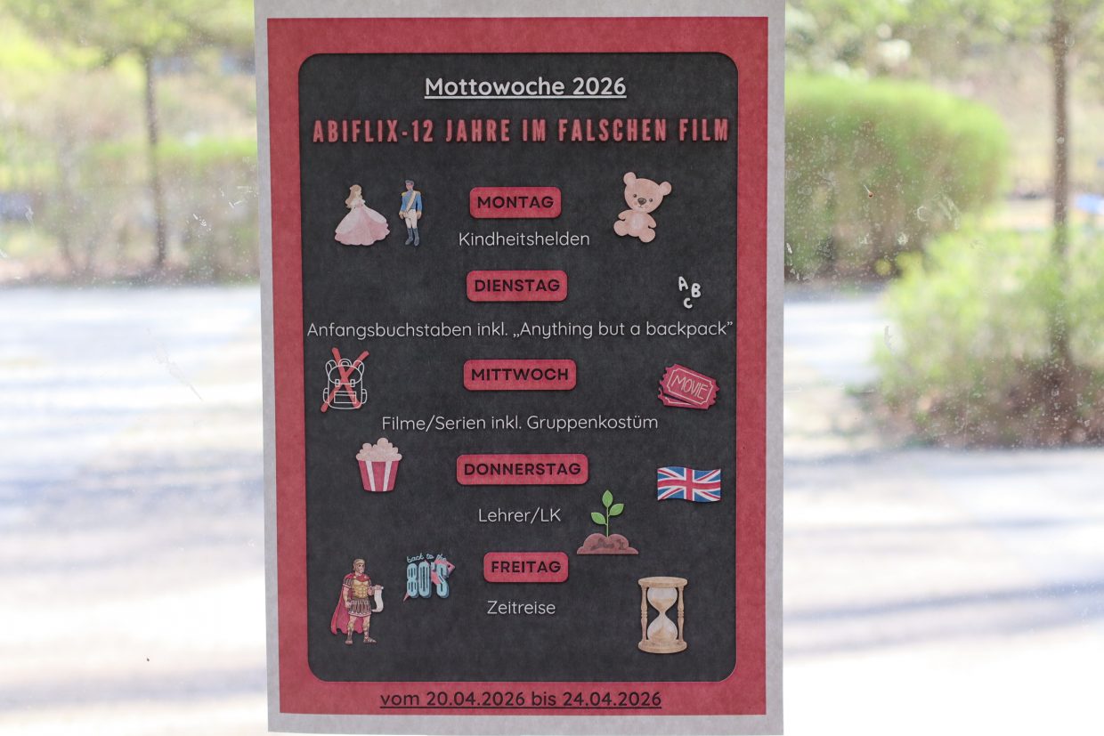 An unserer Schule ist es so, dass in der letzten Woche Mottowoche ist. Deswegen sind die 12. Klassen alle verkleidet. Die Schüler überlegen sich, welches Motto sie jeden Tag haben. Am Montag waren es die Kindheitshelden und am Dienstag soll man sich passend zu seinem Anfangsbuchstaben verkleiden und alles außer einem Rucksack mitbringen. Unten an den Eingängen sind auch Zettel ausgehängt; dort kann man nachschauen, was das Motto für die nächsten Tage ist.