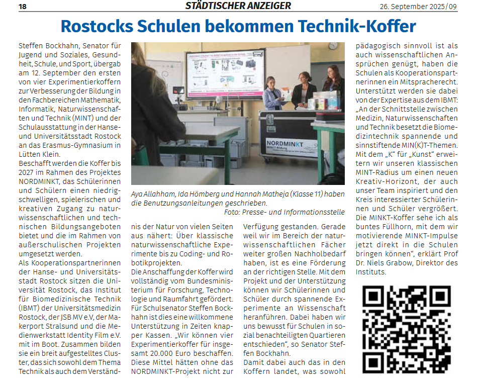 Am 12. September übergab Senator Steffen Bockhahn feierlich den ersten von vier Experimentierkoffern an unser Erasmus-Gymnasium. Die Koffer sind Teil des Projekts NORDMINKT, das bis 2027 naturwissenschaftliche und technische Bildung in Rostock stärkt – mit kreativen, spielerischen Angeboten für Schülerinnen und Schüler.