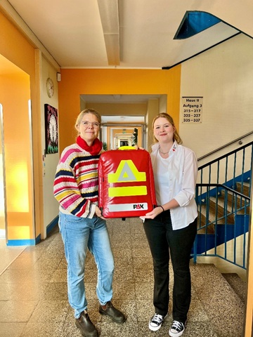 Am Donnerstag, den 16.10.2025 über gab Frau Hannah Hitzemann, Referentin des Jugend-Rot-Kreuzes, im Rahmen der Kooperation des Erasmus-Gymnasiums mit dem Deutschen Roten Kreuz einen neunen Schulsanitäter-Einsatzrucksack an Frau Dr. Alexandra Voß, Leiterin der Schulsanitäter des Erasmus.